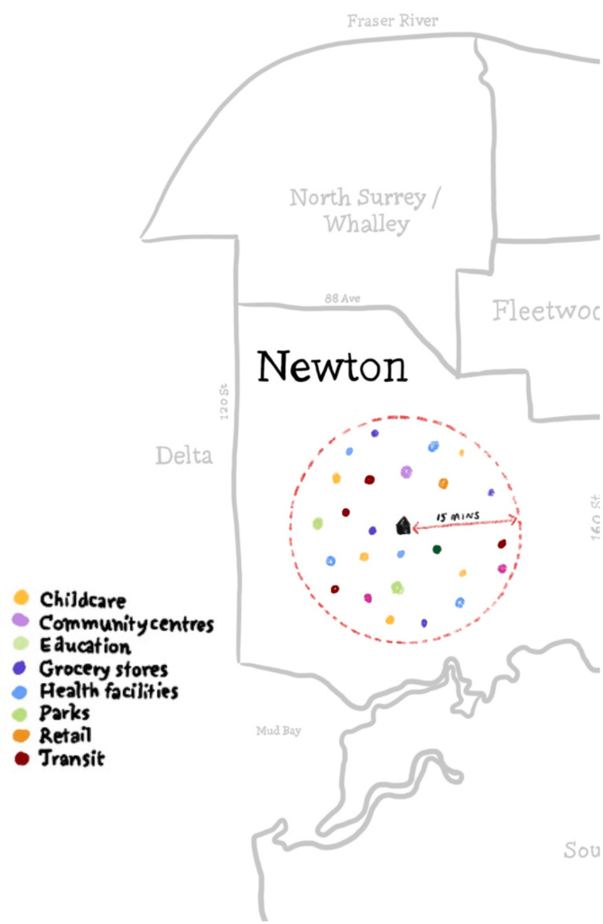 The current car-centric design of neighbourhoods in Surrey perpetuates numerous social, health, and economic disparities. The 15-minute neighbourhood approach seeks to address these issues by ensuring that neighbourhoods are more walkable, inclusive, and socially, financially, and economically resilient.