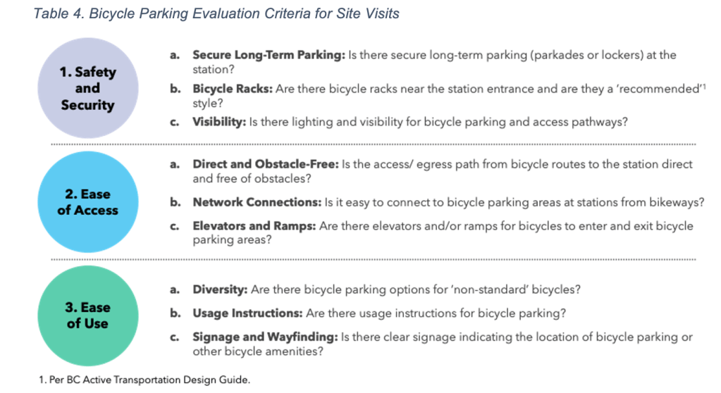 In her thesis, Exploring Bicycle-Transit Integration and Cycling Accessibility to Rail Rapid Transit in Metro Vancouver, Helena Lin (MUrb) unpacks how well integrated the Expo Line is for access by bike. Her thesis assessed integration through spatial access measures, bicycle parking infrastructure, and policy considerations. Table 4 from her thesis lists the criteria she used to evaluate bicycle parking facilities.