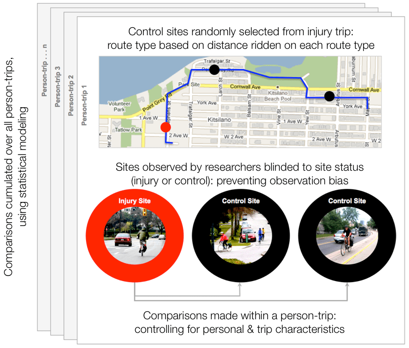 The study’s unique “case-crossover” design is shown in the figure below. It focused on infrastructure characteristics and controlled for exposure. Interviewers queried 690 injured participants about their trip route. Blinded site observers documented route characteristics at the location where the injury event occurred and at two randomly selected locations on the same trip route where no injury occurred (2,070 sites in total). The analysis compared transportation infrastructure at the injury and non-injury sites within each person-trip, cumulated over all trips. This method matched on personal and trip characteristics, thus removing the influence of potential confounders such as age, gender, propensity for risk-taking, bicycle type, clothing conspicuity, lights, helmet use, weather, and time of day.