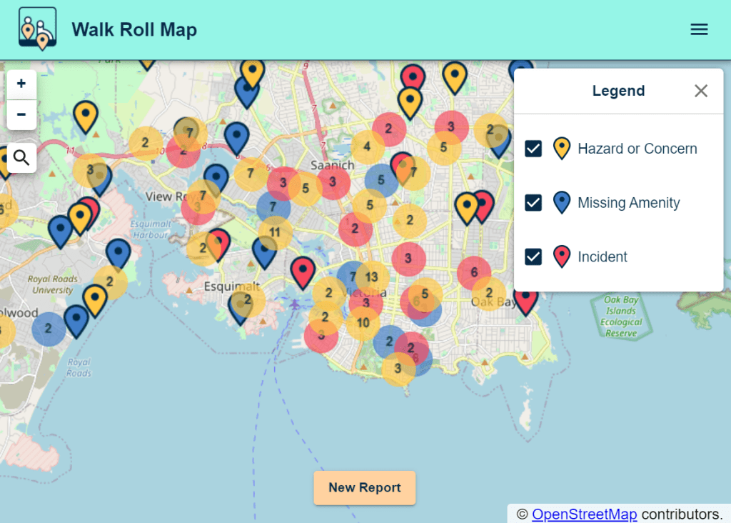 Crowdsourcing offers a way to fill in the data gaps left by traditional sources such as police reports or insurance claims. Building upon their experience with BikeMaps.org, the research team has created WalkRollMap.org to gather reports of barriers to safe, comfortable walking or rolling on sidewalks and pathways. Website users can map three different types of reports: